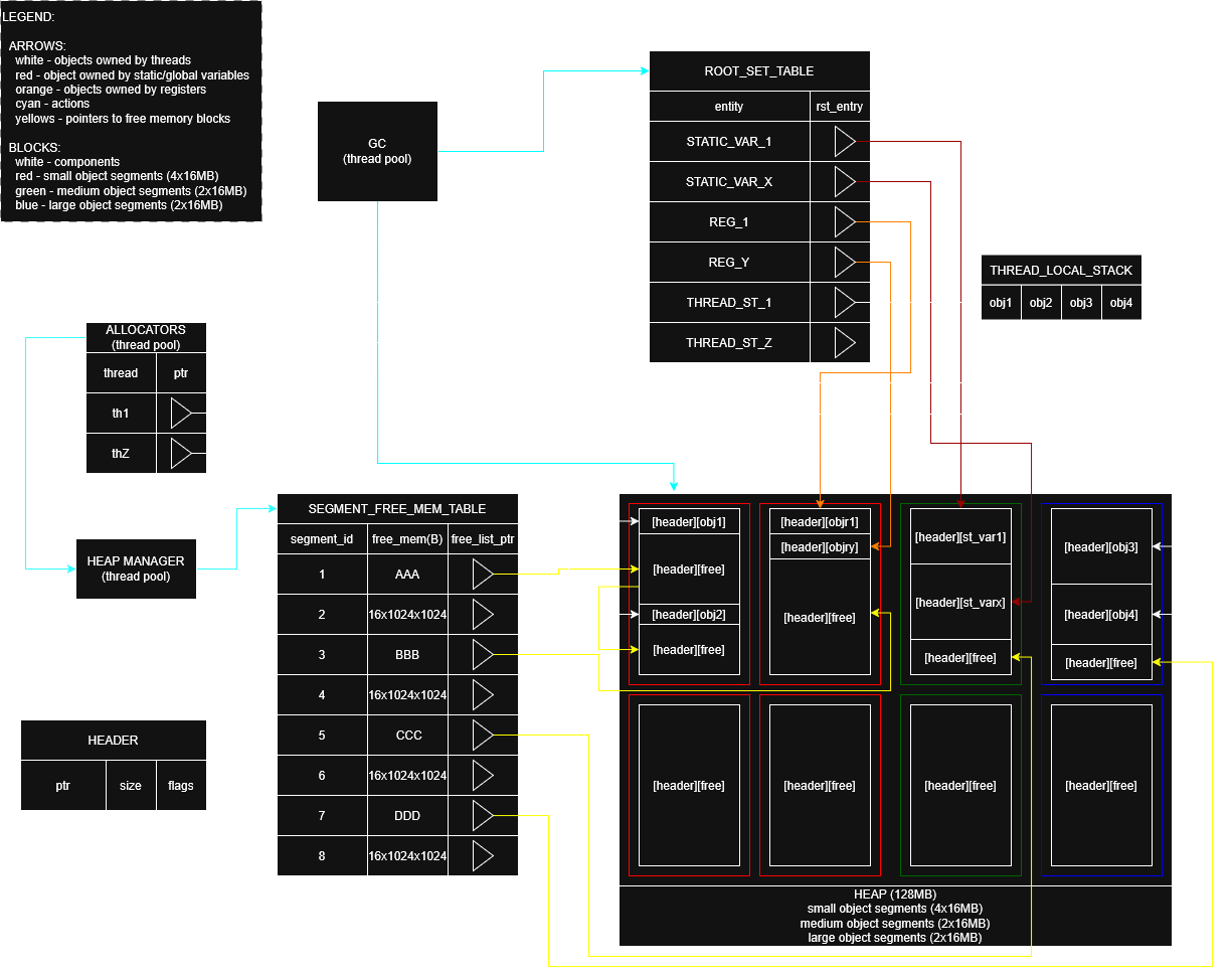heap_manager owns root_set_table, segment_free_memory_table and heap.